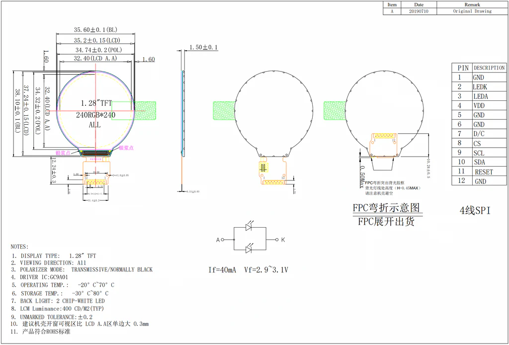 1.28" Round TFT Display 240x240 400nits All View - SPI