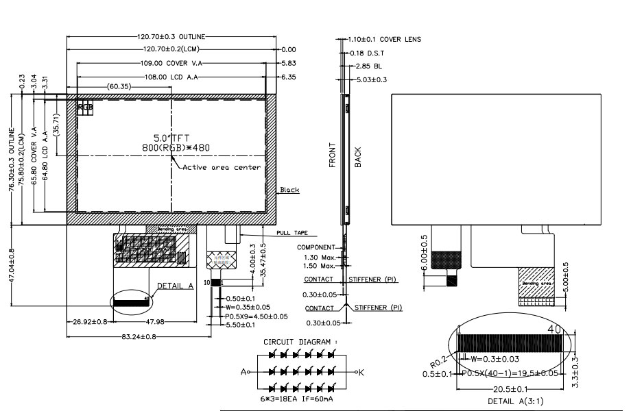 5.0 inch LCD screen IPS type 800×480 TFT LCD module wide viewing angle wide temperature range capacitive touch screen